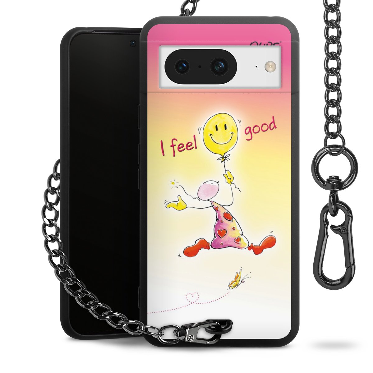 Die Handyhülle verfügt über eine mittig am unteren Rand platzierte Öse, an der die Metallkette stabil befestigt ist. Bestelle die Hülle einfach für Dein Smartphone-Modell, dann passt sie wie angegossen und Du brauchst sie bloß einmal anzudrücken. Handy in die Tasche, Karabiner an den Hosenbund – schon kann die Party starten.