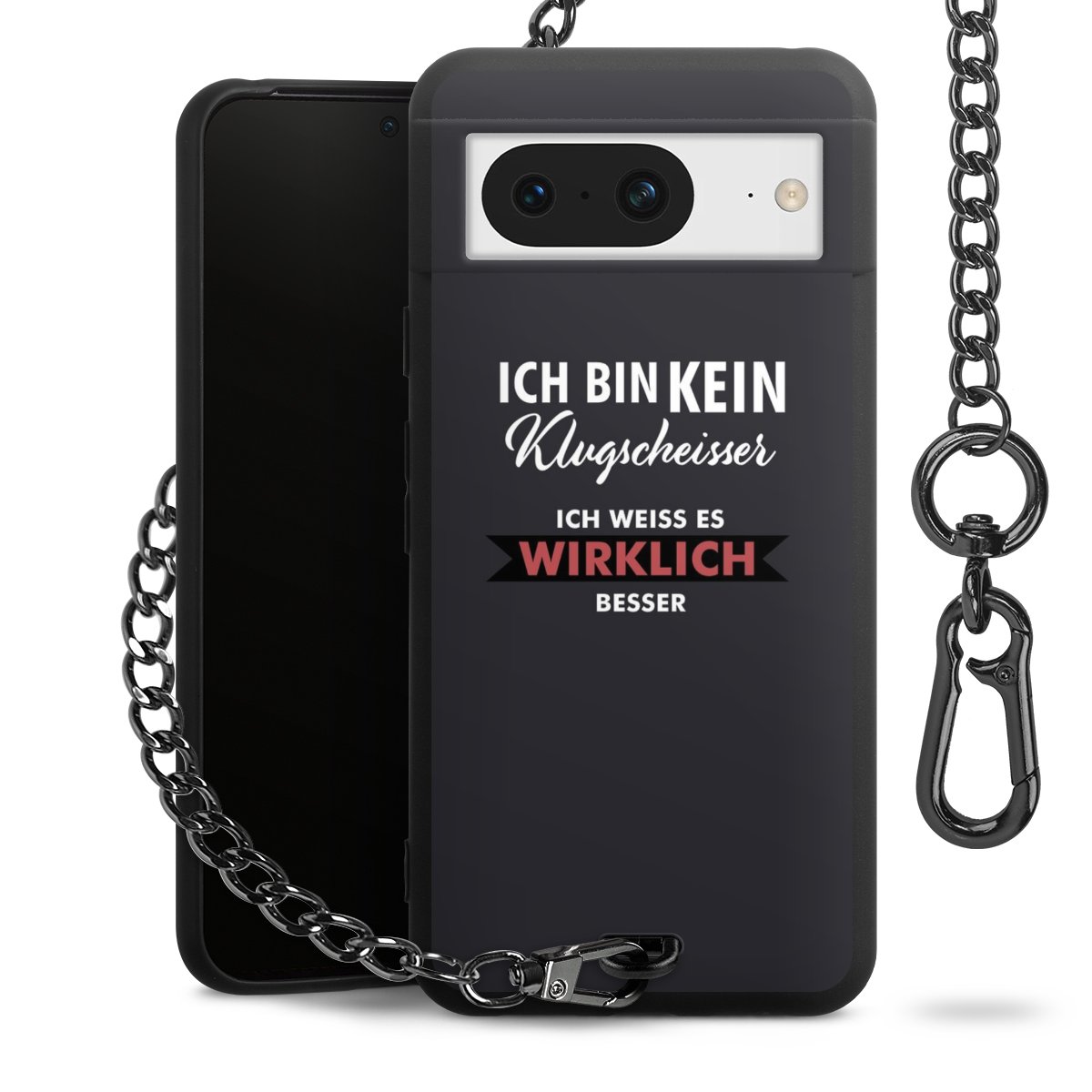 Die mattschwarze Silikon-Handyhülle besteht aus robustem TPU (thermoplastisches Polyurethan). Sie ist flexibel und schützt Dein Smartphone vor Stößen und Kratzern. Die Kette sowie der Karabinerhaken sind aus Metall in Gunmetal-Optik gefertigt. Für dieses Produkt kommen ausschließlich TÜV-geprüfte Materialien zum Einsatz.