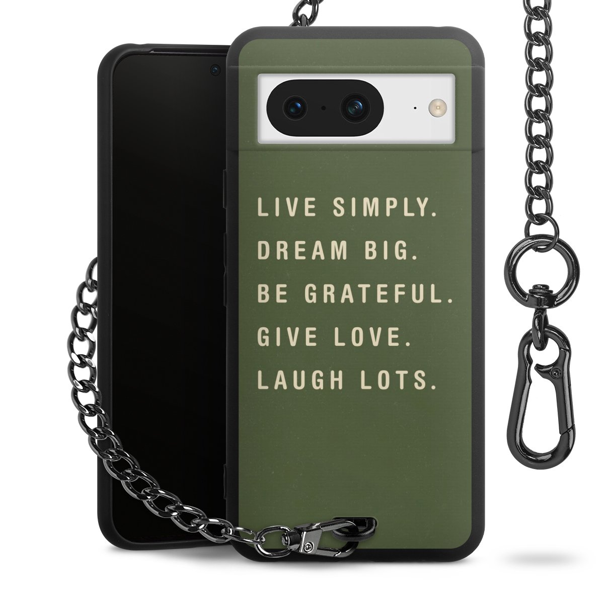 Die mattschwarze Silikon-Handyhülle besteht aus robustem TPU (thermoplastisches Polyurethan). Sie ist flexibel und schützt Dein Smartphone vor Stößen und Kratzern. Die Kette sowie der Karabinerhaken sind aus Metall in Gunmetal-Optik gefertigt. Für dieses Produkt kommen ausschließlich TÜV-geprüfte Materialien zum Einsatz.