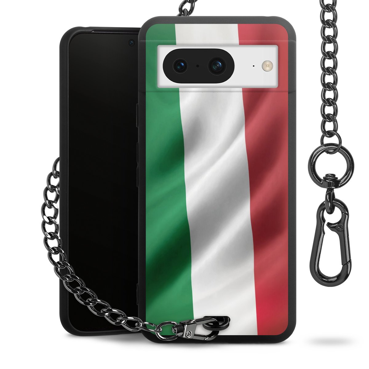 Die mattschwarze Silikon-Handyhülle besteht aus robustem TPU (thermoplastisches Polyurethan). Sie ist flexibel und schützt Dein Smartphone vor Stößen und Kratzern. Die Kette sowie der Karabinerhaken sind aus Metall in Gunmetal-Optik gefertigt. Für dieses Produkt kommen ausschließlich TÜV-geprüfte Materialien zum Einsatz.
