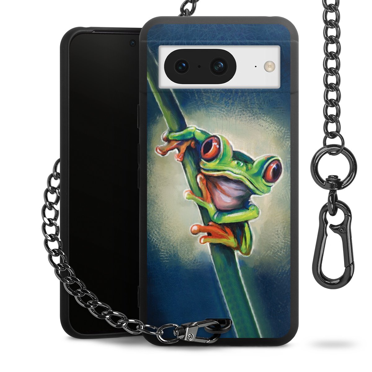 Die Handyhülle verfügt über eine mittig am unteren Rand platzierte Öse, an der die Metallkette stabil befestigt ist. Bestelle die Hülle einfach für Dein Smartphone-Modell, dann passt sie wie angegossen und Du brauchst sie bloß einmal anzudrücken. Handy in die Tasche, Karabiner an den Hosenbund – schon kann die Party starten.