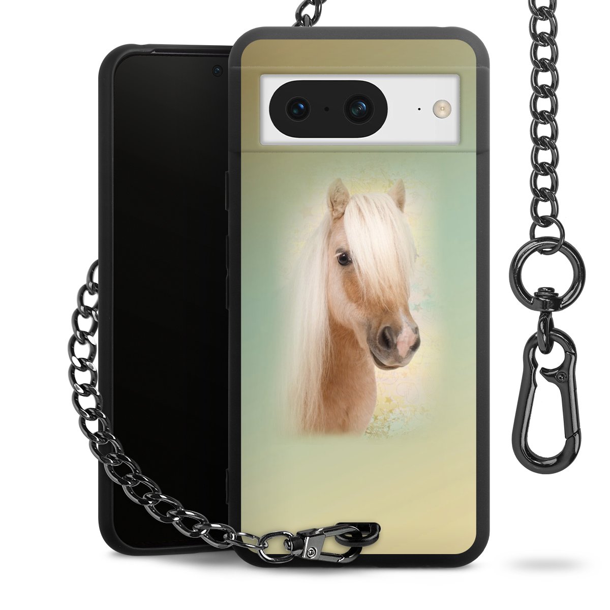 Die Handyhülle verfügt über eine mittig am unteren Rand platzierte Öse, an der die Metallkette stabil befestigt ist. Bestelle die Hülle einfach für Dein Smartphone-Modell, dann passt sie wie angegossen und Du brauchst sie bloß einmal anzudrücken. Handy in die Tasche, Karabiner an den Hosenbund – schon kann die Party starten.