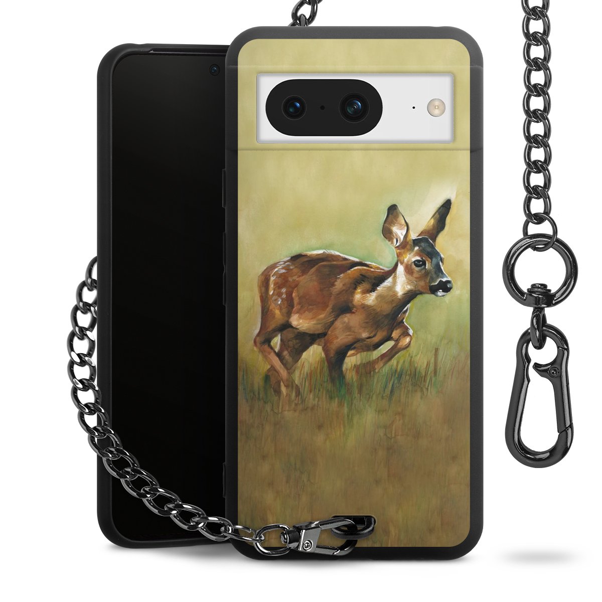 Die Handyhülle verfügt über eine mittig am unteren Rand platzierte Öse, an der die Metallkette stabil befestigt ist. Bestelle die Hülle einfach für Dein Smartphone-Modell, dann passt sie wie angegossen und Du brauchst sie bloß einmal anzudrücken. Handy in die Tasche, Karabiner an den Hosenbund – schon kann die Party starten.