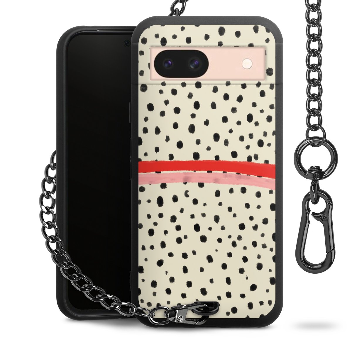 Die mattschwarze Silikon-Handyhülle besteht aus robustem TPU (thermoplastisches Polyurethan). Sie ist flexibel und schützt Dein Smartphone vor Stößen und Kratzern. Die Kette sowie der Karabinerhaken sind aus Metall in Gunmetal-Optik gefertigt. Für dieses Produkt kommen ausschließlich TÜV-geprüfte Materialien zum Einsatz.