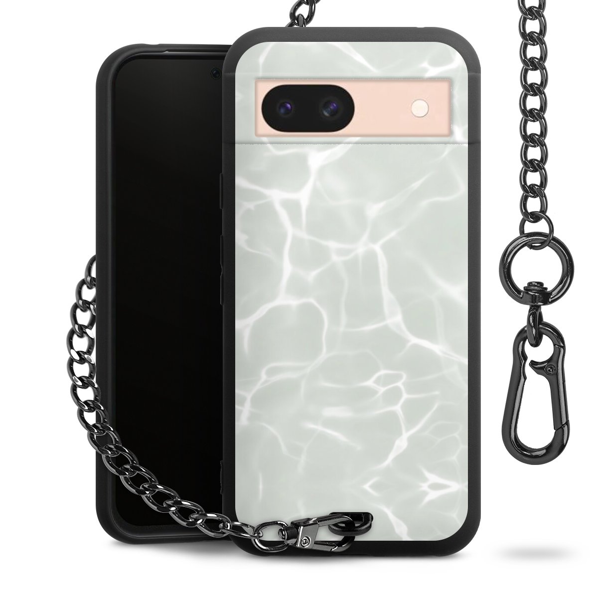 Die mattschwarze Silikon-Handyhülle besteht aus robustem TPU (thermoplastisches Polyurethan). Sie ist flexibel und schützt Dein Smartphone vor Stößen und Kratzern. Die Kette sowie der Karabinerhaken sind aus Metall in Gunmetal-Optik gefertigt. Für dieses Produkt kommen ausschließlich TÜV-geprüfte Materialien zum Einsatz.