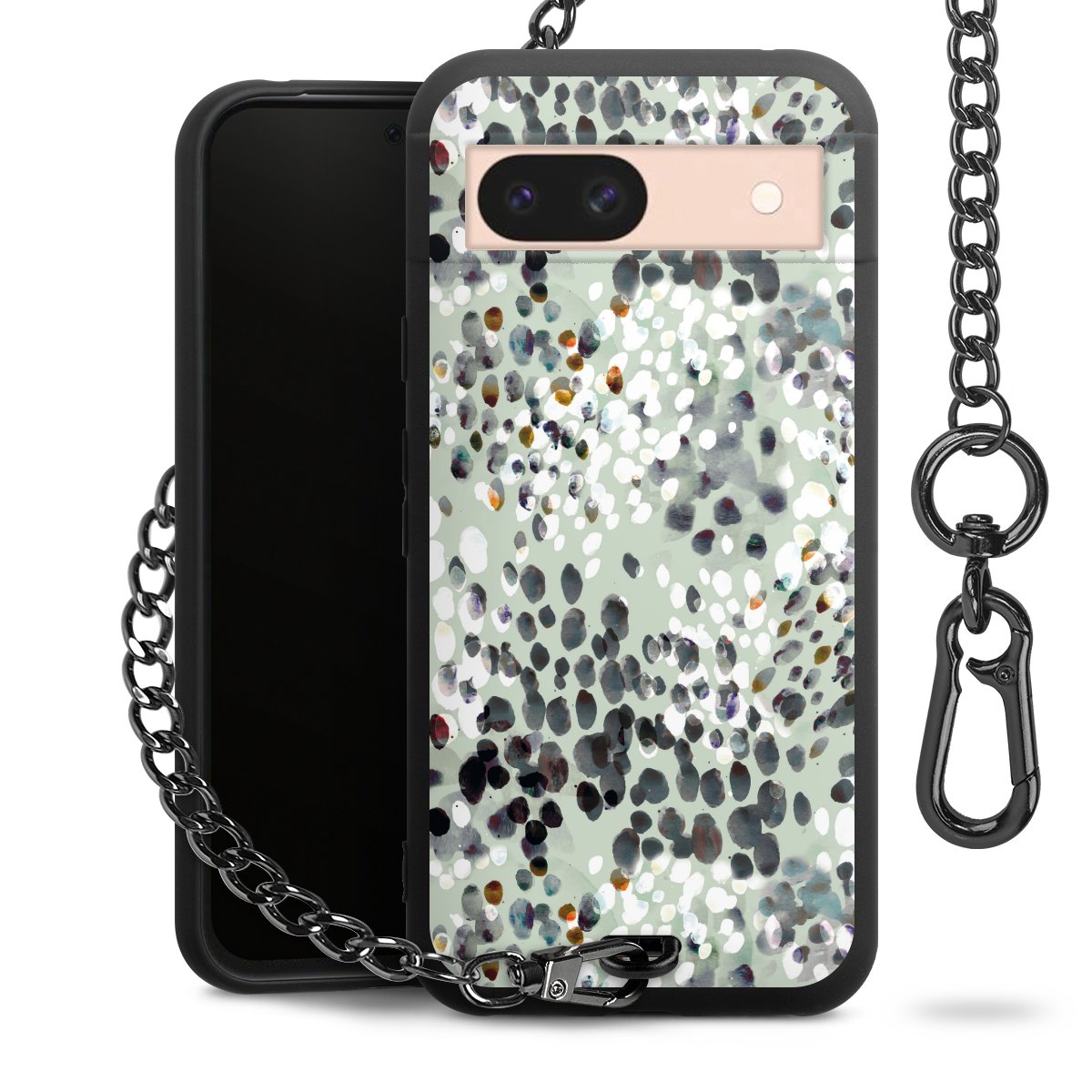 Die mattschwarze Silikon-Handyhülle besteht aus robustem TPU (thermoplastisches Polyurethan). Sie ist flexibel und schützt Dein Smartphone vor Stößen und Kratzern. Die Kette sowie der Karabinerhaken sind aus Metall in Gunmetal-Optik gefertigt. Für dieses Produkt kommen ausschließlich TÜV-geprüfte Materialien zum Einsatz.