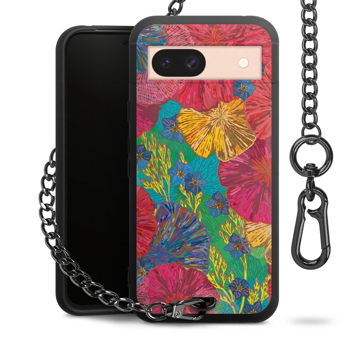 Die mattschwarze Silikon-Handyhülle besteht aus robustem TPU (thermoplastisches Polyurethan). Sie ist flexibel und schützt Dein Smartphone vor Stößen und Kratzern. Die Kette sowie der Karabinerhaken sind aus Metall in Gunmetal-Optik gefertigt. Für dieses Produkt kommen ausschließlich TÜV-geprüfte Materialien zum Einsatz.