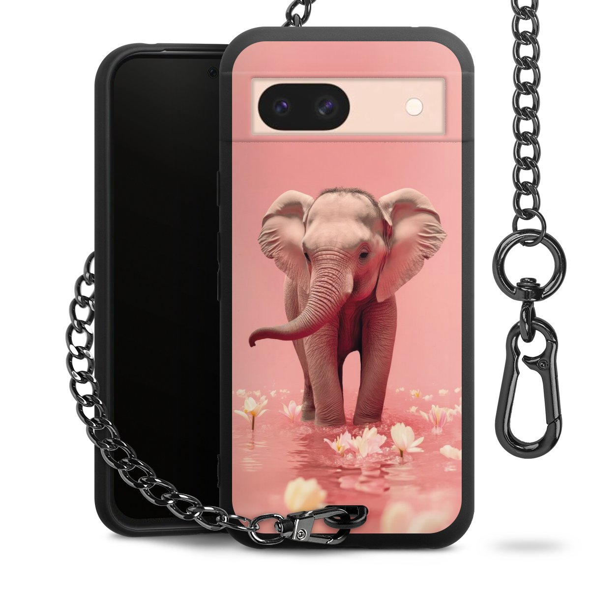 Die Handyhülle verfügt über eine mittig am unteren Rand platzierte Öse, an der die Metallkette stabil befestigt ist. Bestelle die Hülle einfach für Dein Smartphone-Modell, dann passt sie wie angegossen und Du brauchst sie bloß einmal anzudrücken. Handy in die Tasche, Karabiner an den Hosenbund – schon kann die Party starten.