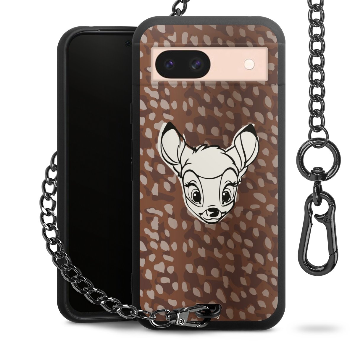 Die Handyhülle verfügt über eine mittig am unteren Rand platzierte Öse, an der die Metallkette stabil befestigt ist. Bestelle die Hülle einfach für Dein Smartphone-Modell, dann passt sie wie angegossen und Du brauchst sie bloß einmal anzudrücken. Handy in die Tasche, Karabiner an den Hosenbund – schon kann die Party starten.