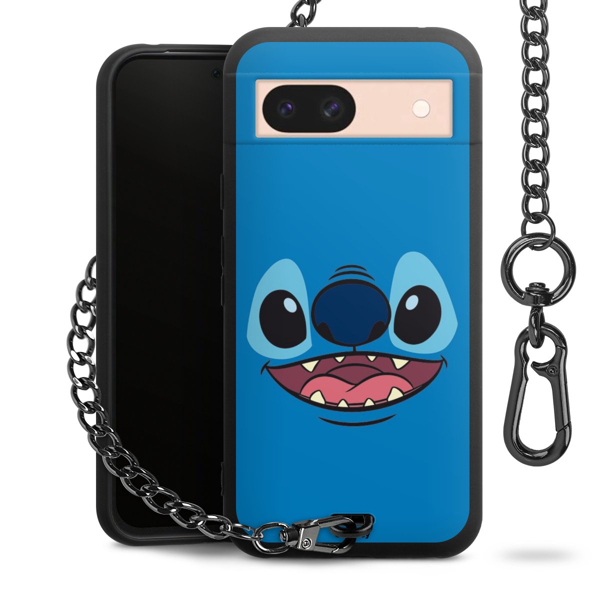 Die Handyhülle verfügt über eine mittig am unteren Rand platzierte Öse, an der die Metallkette stabil befestigt ist. Bestelle die Hülle einfach für Dein Smartphone-Modell, dann passt sie wie angegossen und Du brauchst sie bloß einmal anzudrücken. Handy in die Tasche, Karabiner an den Hosenbund – schon kann die Party starten.