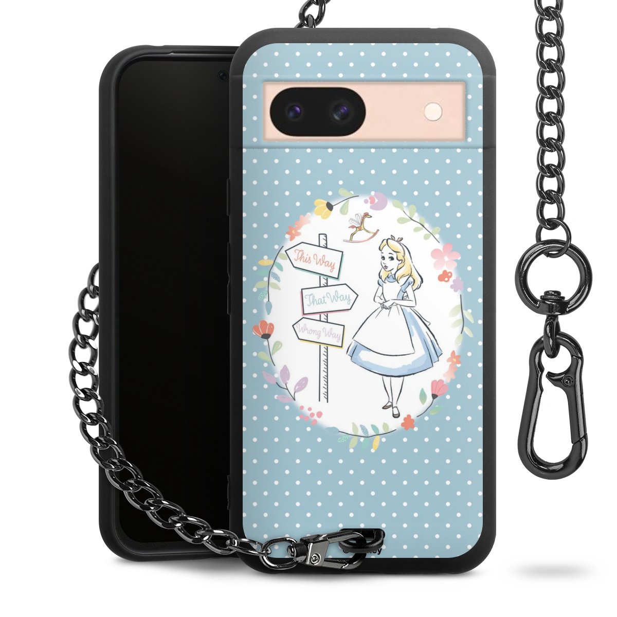 Die Handyhülle verfügt über eine mittig am unteren Rand platzierte Öse, an der die Metallkette stabil befestigt ist. Bestelle die Hülle einfach für Dein Smartphone-Modell, dann passt sie wie angegossen und Du brauchst sie bloß einmal anzudrücken. Handy in die Tasche, Karabiner an den Hosenbund – schon kann die Party starten.