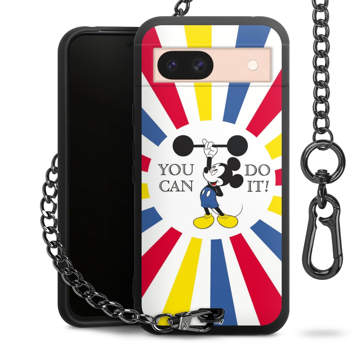 Die Handyhülle verfügt über eine mittig am unteren Rand platzierte Öse, an der die Metallkette stabil befestigt ist. Bestelle die Hülle einfach für Dein Smartphone-Modell, dann passt sie wie angegossen und Du brauchst sie bloß einmal anzudrücken. Handy in die Tasche, Karabiner an den Hosenbund – schon kann die Party starten.