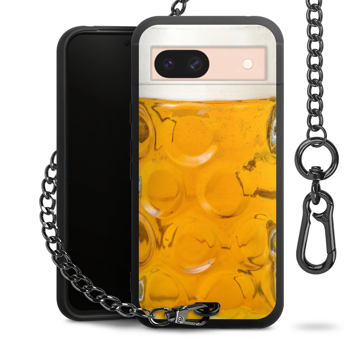 Die Handyhülle verfügt über eine mittig am unteren Rand platzierte Öse, an der die Metallkette stabil befestigt ist. Bestelle die Hülle einfach für Dein Smartphone-Modell, dann passt sie wie angegossen und Du brauchst sie bloß einmal anzudrücken. Handy in die Tasche, Karabiner an den Hosenbund – schon kann die Party starten.