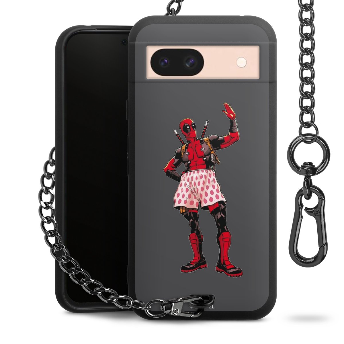 Die mattschwarze Silikon-Handyhülle besteht aus robustem TPU (thermoplastisches Polyurethan). Sie ist flexibel und schützt Dein Smartphone vor Stößen und Kratzern. Die Kette sowie der Karabinerhaken sind aus Metall in Gunmetal-Optik gefertigt. Für dieses Produkt kommen ausschließlich TÜV-geprüfte Materialien zum Einsatz.