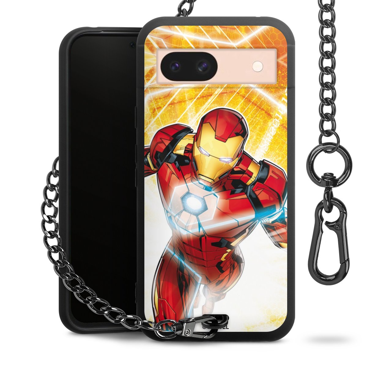 Die mattschwarze Silikon-Handyhülle besteht aus robustem TPU (thermoplastisches Polyurethan). Sie ist flexibel und schützt Dein Smartphone vor Stößen und Kratzern. Die Kette sowie der Karabinerhaken sind aus Metall in Gunmetal-Optik gefertigt. Für dieses Produkt kommen ausschließlich TÜV-geprüfte Materialien zum Einsatz.