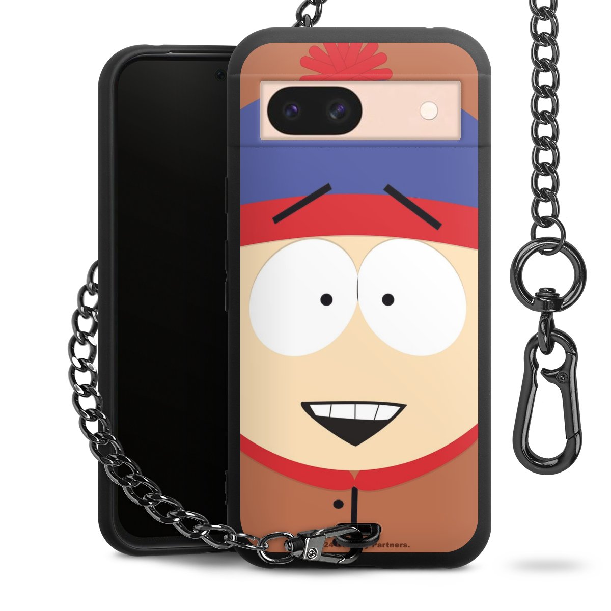 Die Handyhülle verfügt über eine mittig am unteren Rand platzierte Öse, an der die Metallkette stabil befestigt ist. Bestelle die Hülle einfach für Dein Smartphone-Modell, dann passt sie wie angegossen und Du brauchst sie bloß einmal anzudrücken. Handy in die Tasche, Karabiner an den Hosenbund – schon kann die Party starten.