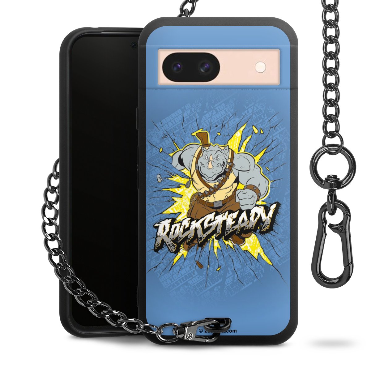 Die mattschwarze Silikon-Handyhülle besteht aus robustem TPU (thermoplastisches Polyurethan). Sie ist flexibel und schützt Dein Smartphone vor Stößen und Kratzern. Die Kette sowie der Karabinerhaken sind aus Metall in Gunmetal-Optik gefertigt. Für dieses Produkt kommen ausschließlich TÜV-geprüfte Materialien zum Einsatz.