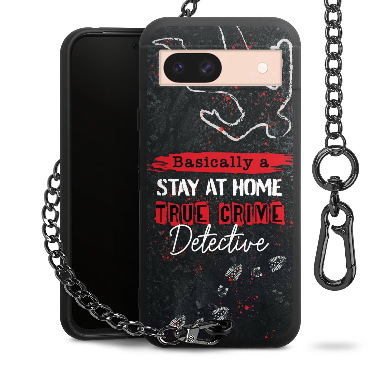 Die mattschwarze Silikon-Handyhülle besteht aus robustem TPU (thermoplastisches Polyurethan). Sie ist flexibel und schützt Dein Smartphone vor Stößen und Kratzern. Die Kette sowie der Karabinerhaken sind aus Metall in Gunmetal-Optik gefertigt. Für dieses Produkt kommen ausschließlich TÜV-geprüfte Materialien zum Einsatz.