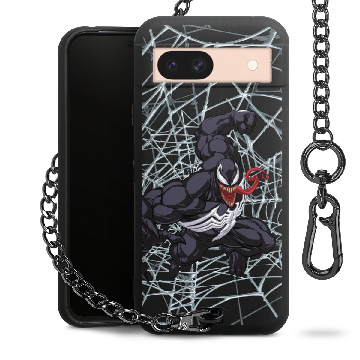 Die mattschwarze Silikon-Handyhülle besteht aus robustem TPU (thermoplastisches Polyurethan). Sie ist flexibel und schützt Dein Smartphone vor Stößen und Kratzern. Die Kette sowie der Karabinerhaken sind aus Metall in Gunmetal-Optik gefertigt. Für dieses Produkt kommen ausschließlich TÜV-geprüfte Materialien zum Einsatz.