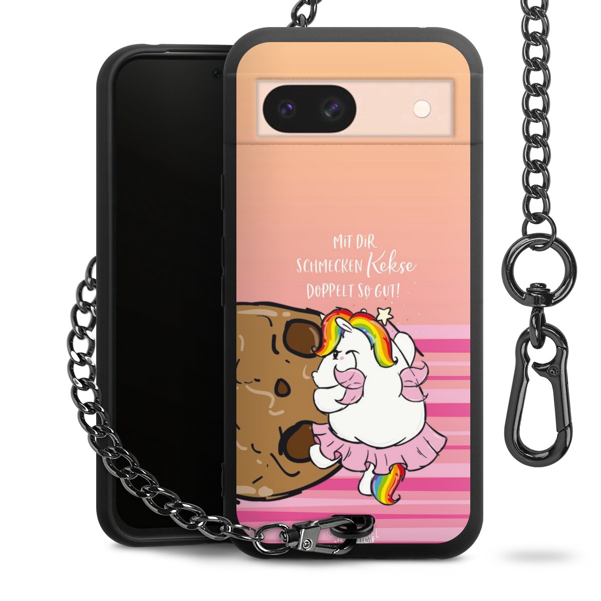 Die mattschwarze Silikon-Handyhülle besteht aus robustem TPU (thermoplastisches Polyurethan). Sie ist flexibel und schützt Dein Smartphone vor Stößen und Kratzern. Die Kette sowie der Karabinerhaken sind aus Metall in Gunmetal-Optik gefertigt. Für dieses Produkt kommen ausschließlich TÜV-geprüfte Materialien zum Einsatz.