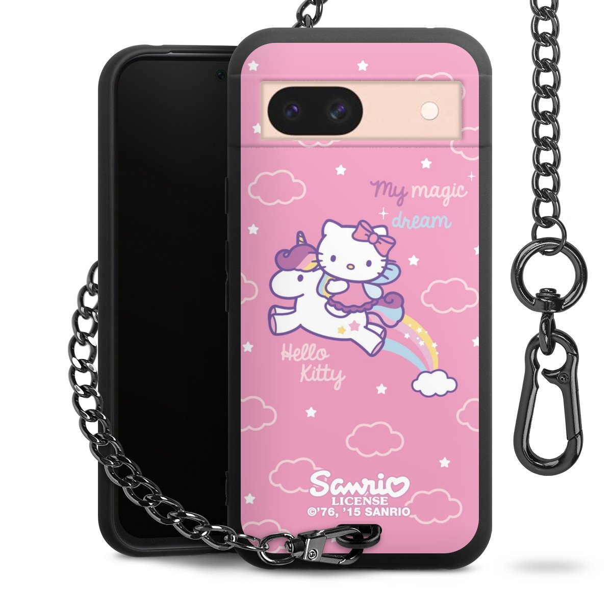 Die Handyhülle verfügt über eine mittig am unteren Rand platzierte Öse, an der die Metallkette stabil befestigt ist. Bestelle die Hülle einfach für Dein Smartphone-Modell, dann passt sie wie angegossen und Du brauchst sie bloß einmal anzudrücken. Handy in die Tasche, Karabiner an den Hosenbund – schon kann die Party starten.