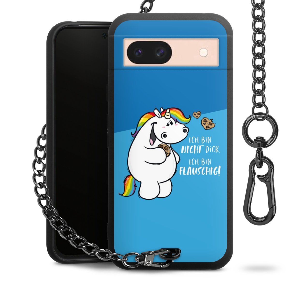 Die mattschwarze Silikon-Handyhülle besteht aus robustem TPU (thermoplastisches Polyurethan). Sie ist flexibel und schützt Dein Smartphone vor Stößen und Kratzern. Die Kette sowie der Karabinerhaken sind aus Metall in Gunmetal-Optik gefertigt. Für dieses Produkt kommen ausschließlich TÜV-geprüfte Materialien zum Einsatz.