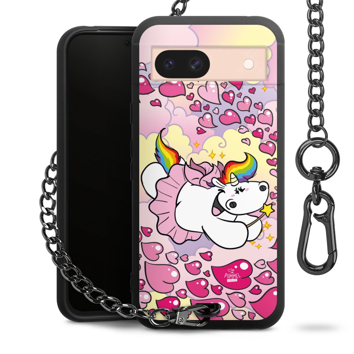 Die mattschwarze Silikon-Handyhülle besteht aus robustem TPU (thermoplastisches Polyurethan). Sie ist flexibel und schützt Dein Smartphone vor Stößen und Kratzern. Die Kette sowie der Karabinerhaken sind aus Metall in Gunmetal-Optik gefertigt. Für dieses Produkt kommen ausschließlich TÜV-geprüfte Materialien zum Einsatz.