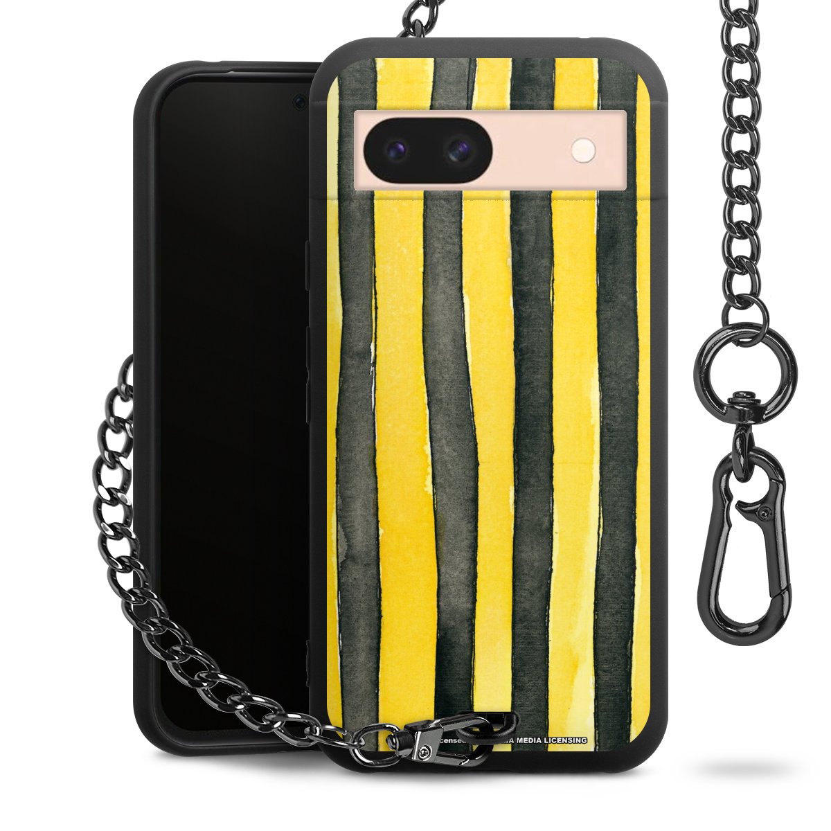 Die mattschwarze Silikon-Handyhülle besteht aus robustem TPU (thermoplastisches Polyurethan). Sie ist flexibel und schützt Dein Smartphone vor Stößen und Kratzern. Die Kette sowie der Karabinerhaken sind aus Metall in Gunmetal-Optik gefertigt. Für dieses Produkt kommen ausschließlich TÜV-geprüfte Materialien zum Einsatz.