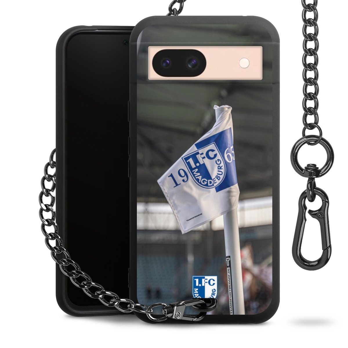 Die Handyhülle verfügt über eine mittig am unteren Rand platzierte Öse, an der die Metallkette stabil befestigt ist. Bestelle die Hülle einfach für Dein Smartphone-Modell, dann passt sie wie angegossen und Du brauchst sie bloß einmal anzudrücken. Handy in die Tasche, Karabiner an den Hosenbund – schon kann die Party starten.