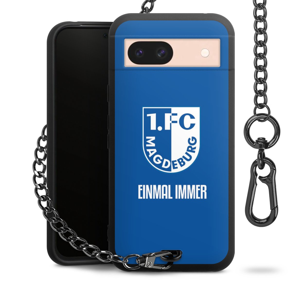 Die Handyhülle verfügt über eine mittig am unteren Rand platzierte Öse, an der die Metallkette stabil befestigt ist. Bestelle die Hülle einfach für Dein Smartphone-Modell, dann passt sie wie angegossen und Du brauchst sie bloß einmal anzudrücken. Handy in die Tasche, Karabiner an den Hosenbund – schon kann die Party starten.