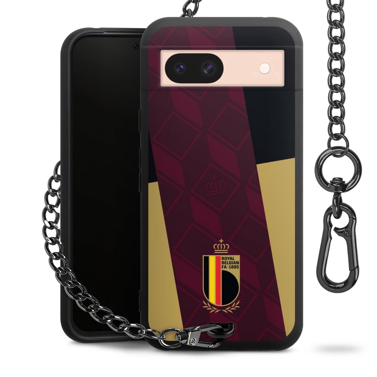 Die mattschwarze Silikon-Handyhülle besteht aus robustem TPU (thermoplastisches Polyurethan). Sie ist flexibel und schützt Dein Smartphone vor Stößen und Kratzern. Die Kette sowie der Karabinerhaken sind aus Metall in Gunmetal-Optik gefertigt. Für dieses Produkt kommen ausschließlich TÜV-geprüfte Materialien zum Einsatz.