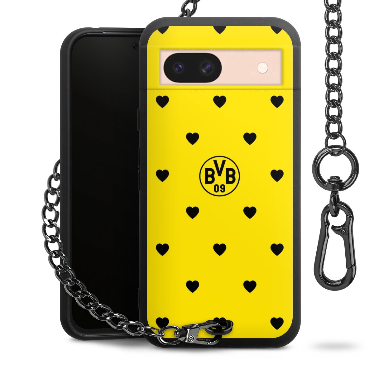 Die mattschwarze Silikon-Handyhülle besteht aus robustem TPU (thermoplastisches Polyurethan). Sie ist flexibel und schützt Dein Smartphone vor Stößen und Kratzern. Die Kette sowie der Karabinerhaken sind aus Metall in Gunmetal-Optik gefertigt. Für dieses Produkt kommen ausschließlich TÜV-geprüfte Materialien zum Einsatz.