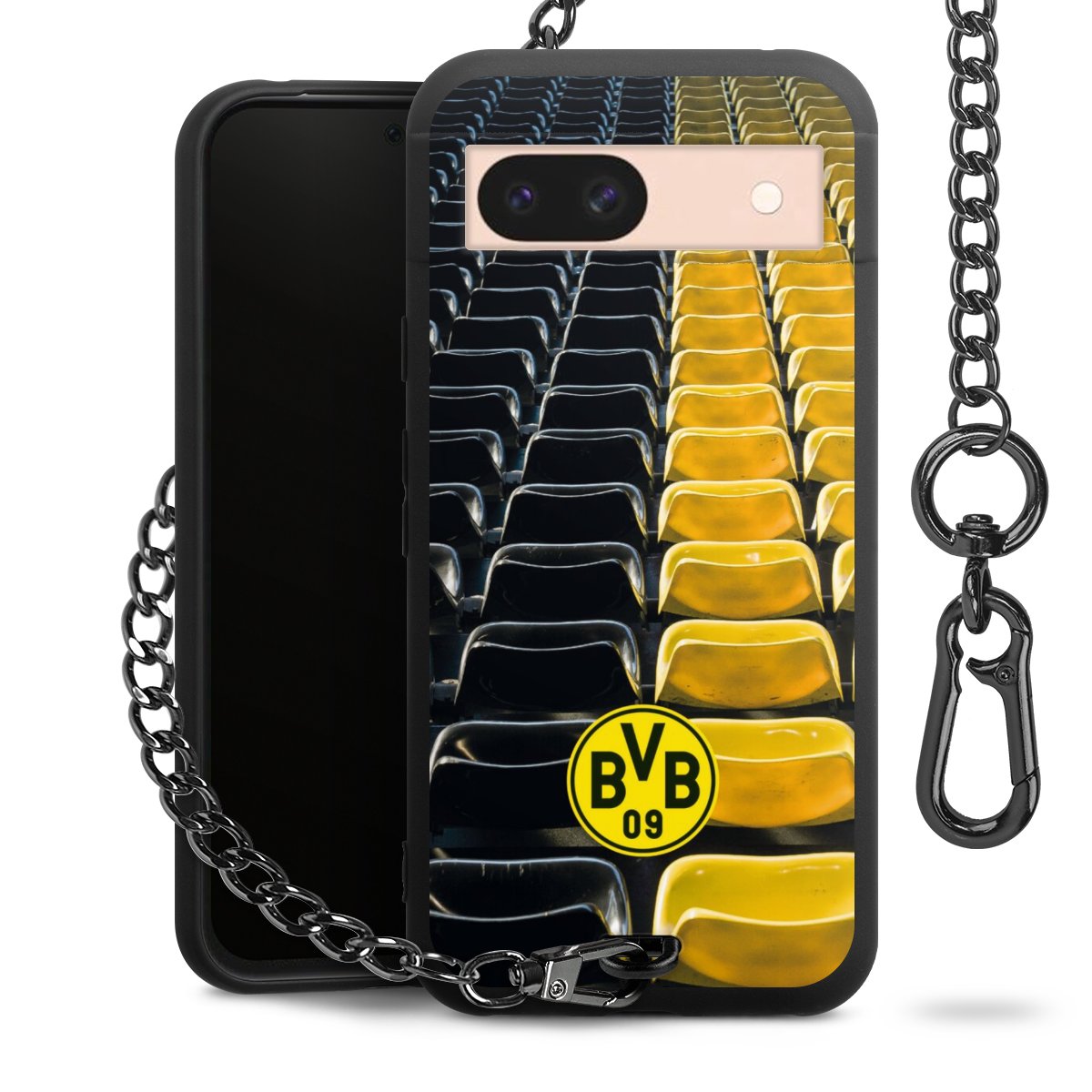 Die mattschwarze Silikon-Handyhülle besteht aus robustem TPU (thermoplastisches Polyurethan). Sie ist flexibel und schützt Dein Smartphone vor Stößen und Kratzern. Die Kette sowie der Karabinerhaken sind aus Metall in Gunmetal-Optik gefertigt. Für dieses Produkt kommen ausschließlich TÜV-geprüfte Materialien zum Einsatz.