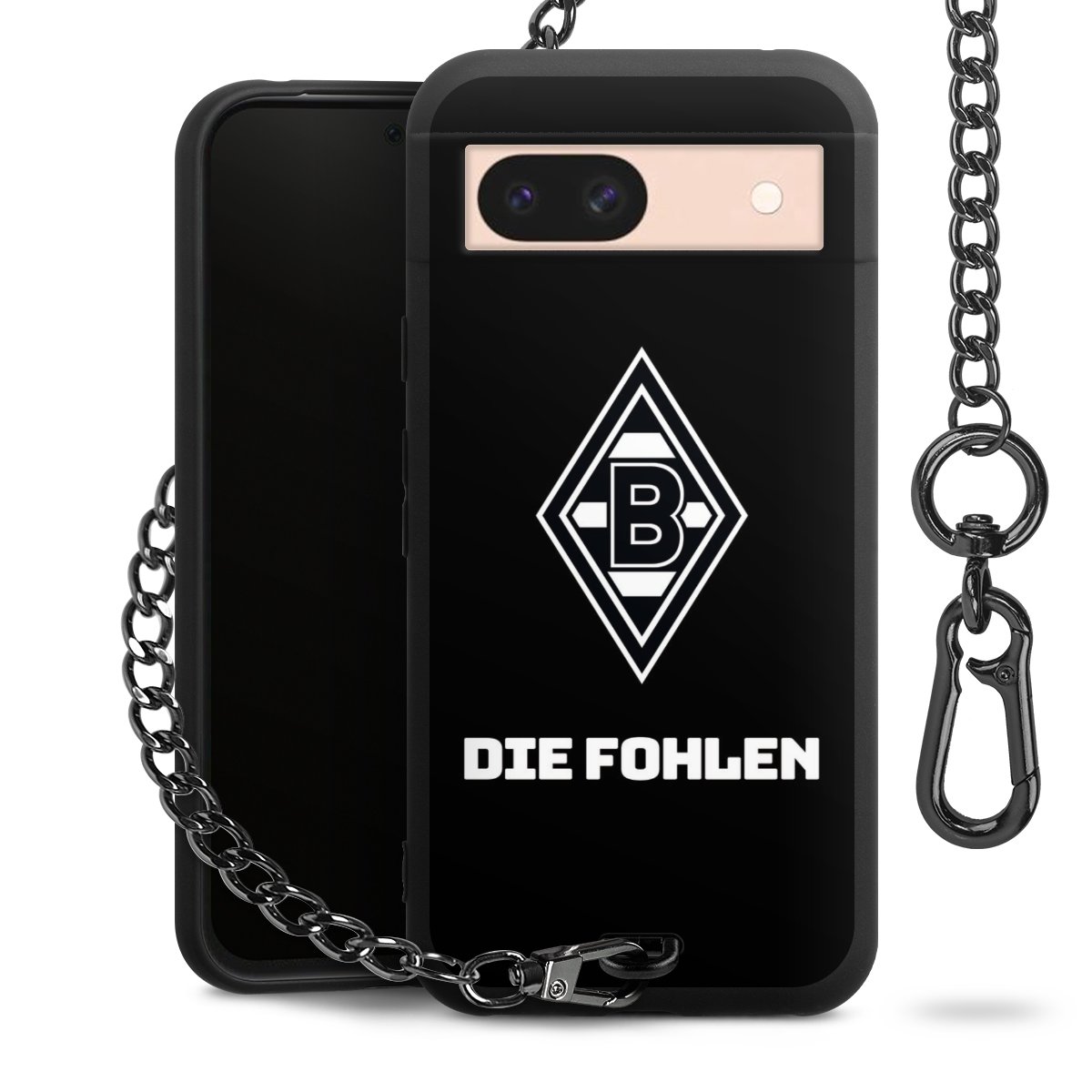 Die mattschwarze Silikon-Handyhülle besteht aus robustem TPU (thermoplastisches Polyurethan). Sie ist flexibel und schützt Dein Smartphone vor Stößen und Kratzern. Die Kette sowie der Karabinerhaken sind aus Metall in Gunmetal-Optik gefertigt. Für dieses Produkt kommen ausschließlich TÜV-geprüfte Materialien zum Einsatz.