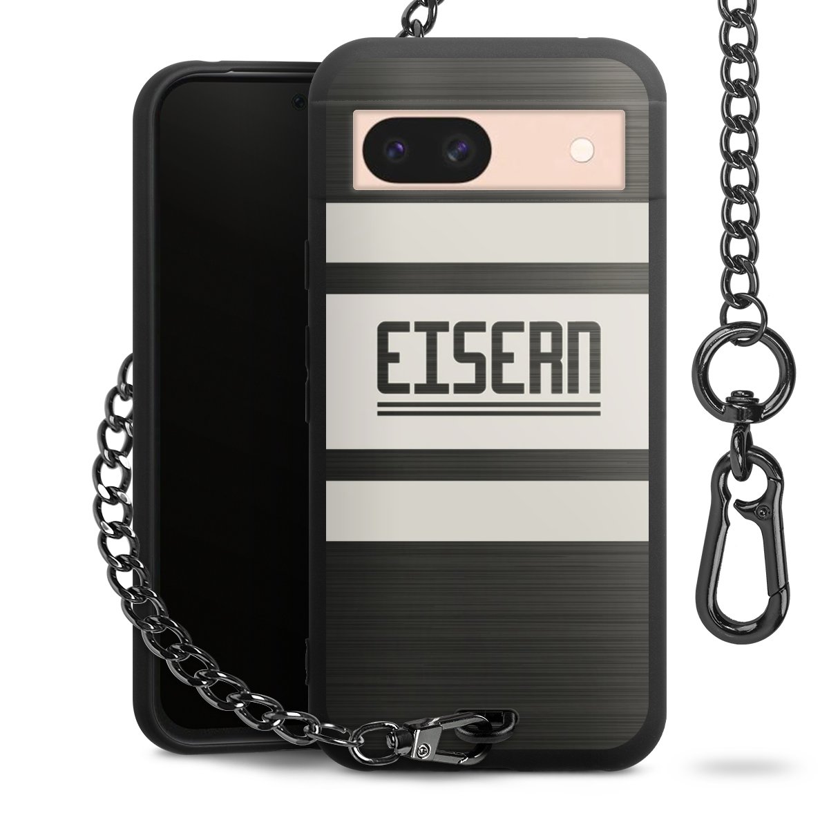 Die mattschwarze Silikon-Handyhülle besteht aus robustem TPU (thermoplastisches Polyurethan). Sie ist flexibel und schützt Dein Smartphone vor Stößen und Kratzern. Die Kette sowie der Karabinerhaken sind aus Metall in Gunmetal-Optik gefertigt. Für dieses Produkt kommen ausschließlich TÜV-geprüfte Materialien zum Einsatz.