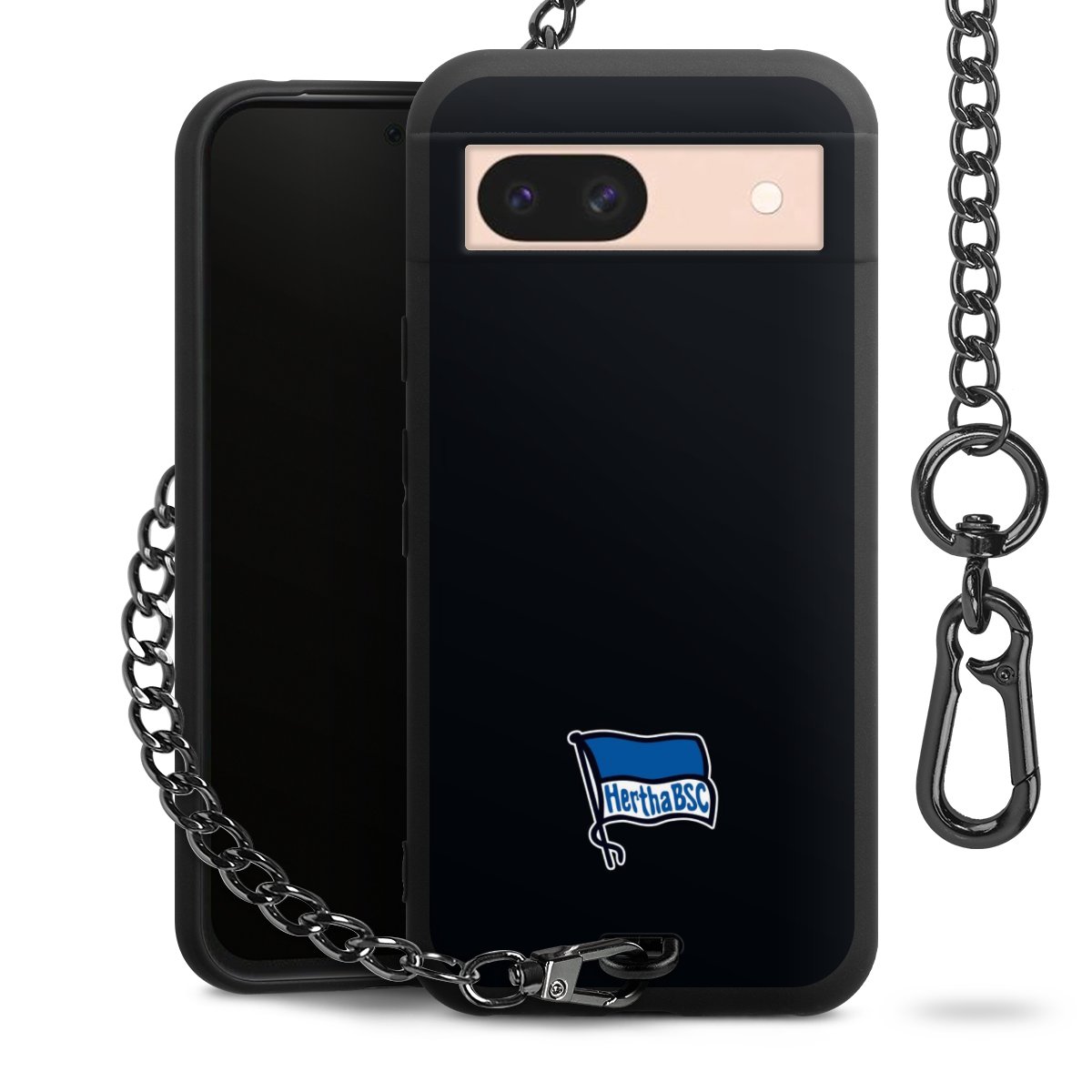 Die mattschwarze Silikon-Handyhülle besteht aus robustem TPU (thermoplastisches Polyurethan). Sie ist flexibel und schützt Dein Smartphone vor Stößen und Kratzern. Die Kette sowie der Karabinerhaken sind aus Metall in Gunmetal-Optik gefertigt. Für dieses Produkt kommen ausschließlich TÜV-geprüfte Materialien zum Einsatz.