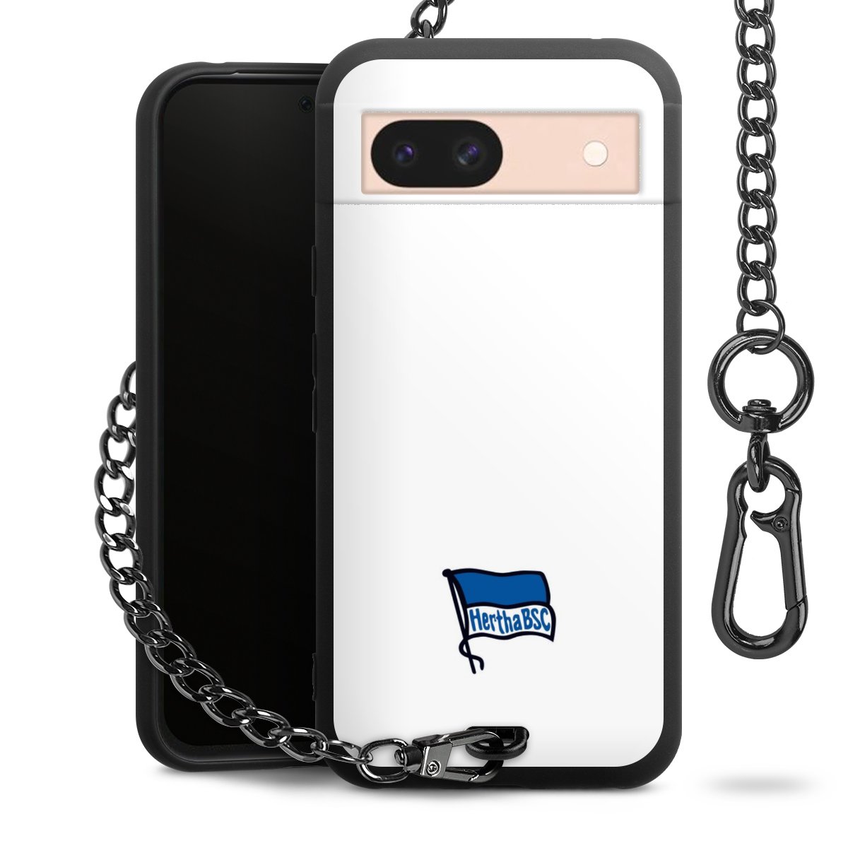 Die mattschwarze Silikon-Handyhülle besteht aus robustem TPU (thermoplastisches Polyurethan). Sie ist flexibel und schützt Dein Smartphone vor Stößen und Kratzern. Die Kette sowie der Karabinerhaken sind aus Metall in Gunmetal-Optik gefertigt. Für dieses Produkt kommen ausschließlich TÜV-geprüfte Materialien zum Einsatz.