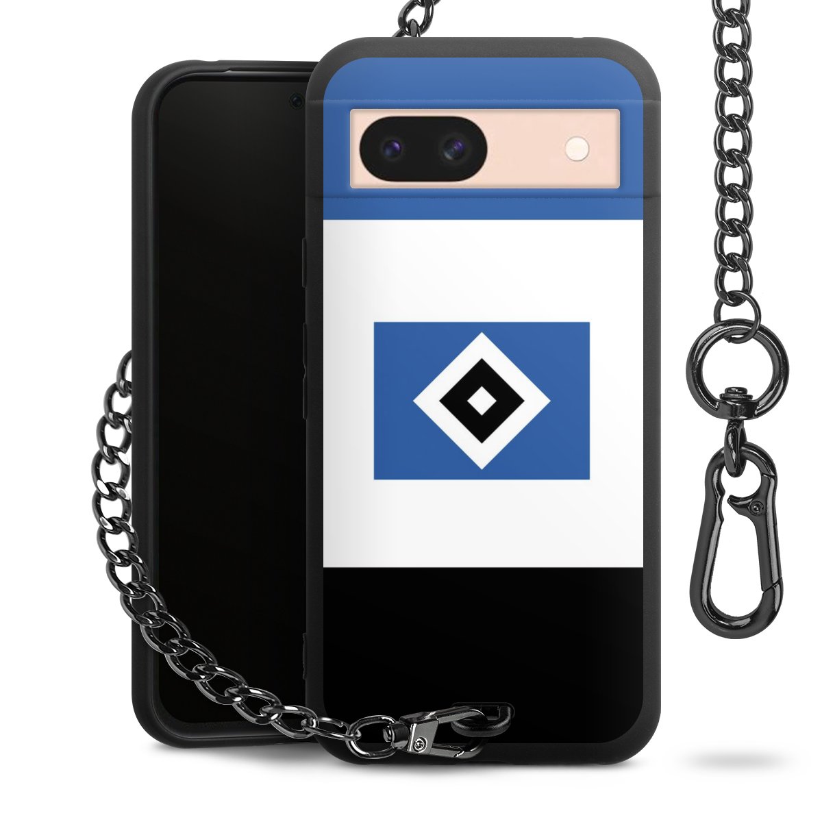 Die mattschwarze Silikon-Handyhülle besteht aus robustem TPU (thermoplastisches Polyurethan). Sie ist flexibel und schützt Dein Smartphone vor Stößen und Kratzern. Die Kette sowie der Karabinerhaken sind aus Metall in Gunmetal-Optik gefertigt. Für dieses Produkt kommen ausschließlich TÜV-geprüfte Materialien zum Einsatz.