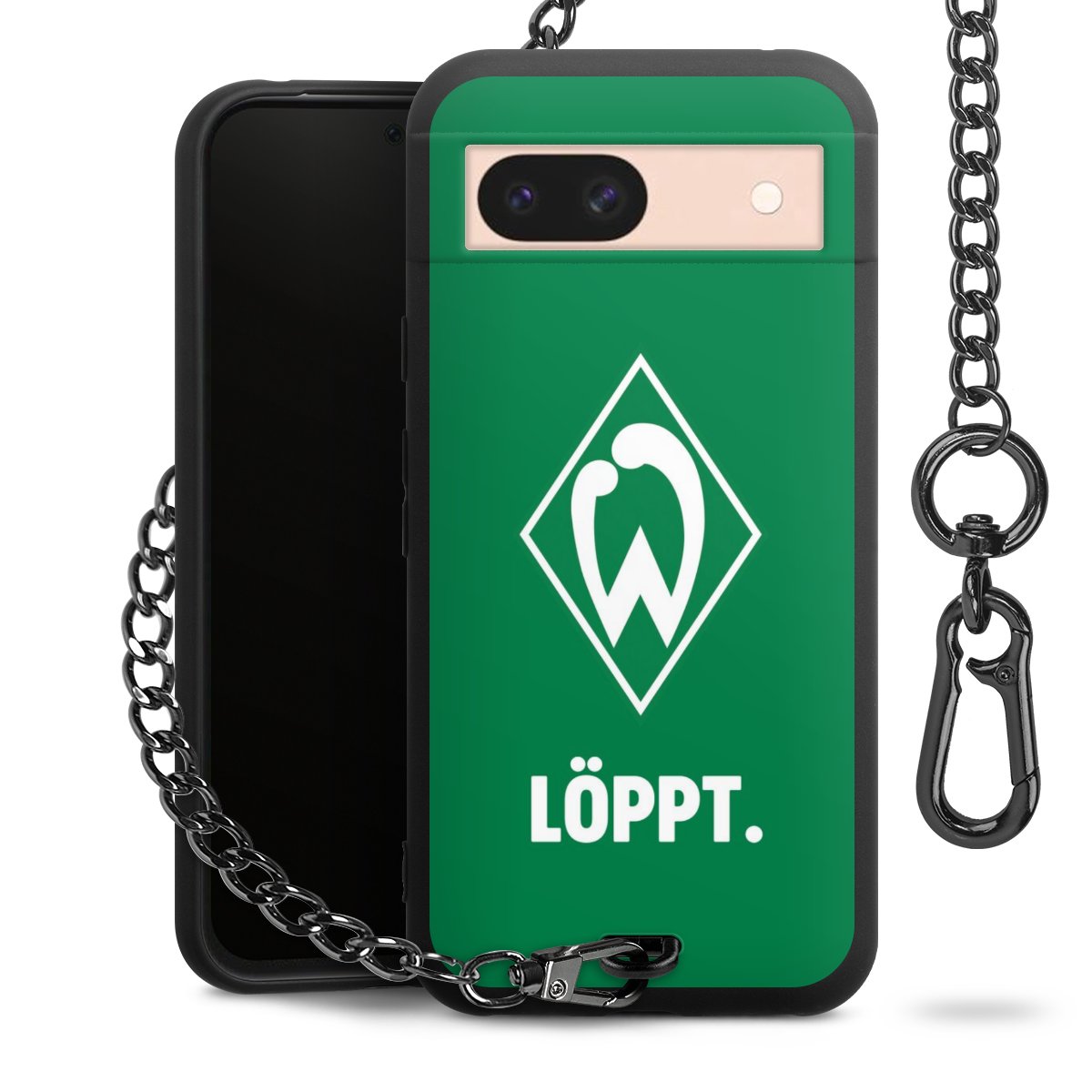 Die mattschwarze Silikon-Handyhülle besteht aus robustem TPU (thermoplastisches Polyurethan). Sie ist flexibel und schützt Dein Smartphone vor Stößen und Kratzern. Die Kette sowie der Karabinerhaken sind aus Metall in Gunmetal-Optik gefertigt. Für dieses Produkt kommen ausschließlich TÜV-geprüfte Materialien zum Einsatz.
