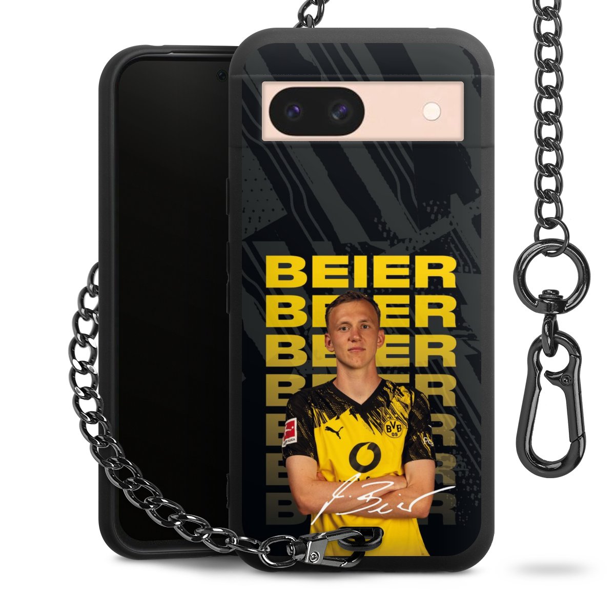 Die mattschwarze Silikon-Handyhülle besteht aus robustem TPU (thermoplastisches Polyurethan). Sie ist flexibel und schützt Dein Smartphone vor Stößen und Kratzern. Die Kette sowie der Karabinerhaken sind aus Metall in Gunmetal-Optik gefertigt. Für dieses Produkt kommen ausschließlich TÜV-geprüfte Materialien zum Einsatz.