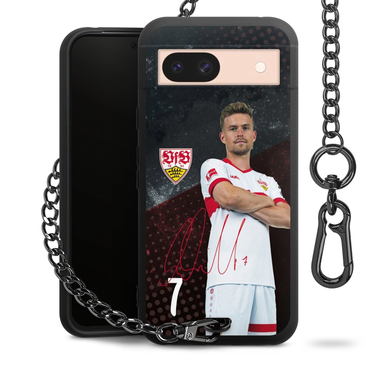 Die mattschwarze Silikon-Handyhülle besteht aus robustem TPU (thermoplastisches Polyurethan). Sie ist flexibel und schützt Dein Smartphone vor Stößen und Kratzern. Die Kette sowie der Karabinerhaken sind aus Metall in Gunmetal-Optik gefertigt. Für dieses Produkt kommen ausschließlich TÜV-geprüfte Materialien zum Einsatz.