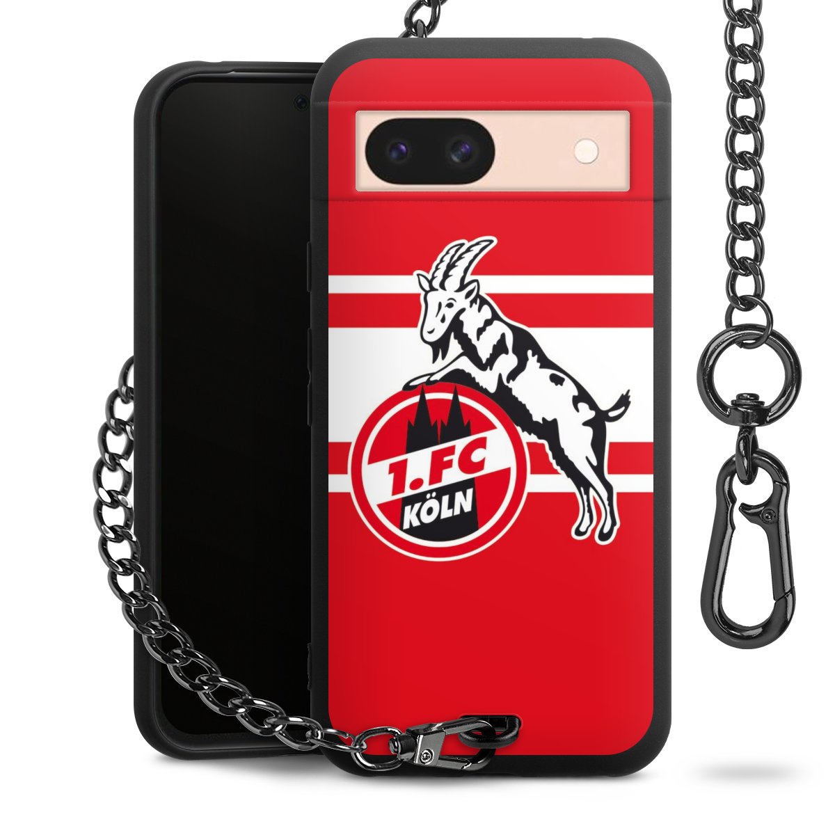 Die Handyhülle verfügt über eine mittig am unteren Rand platzierte Öse, an der die Metallkette stabil befestigt ist. Bestelle die Hülle einfach für Dein Smartphone-Modell, dann passt sie wie angegossen und Du brauchst sie bloß einmal anzudrücken. Handy in die Tasche, Karabiner an den Hosenbund – schon kann die Party starten.