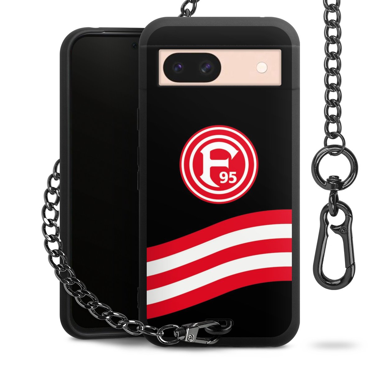 Die Handyhülle verfügt über eine mittig am unteren Rand platzierte Öse, an der die Metallkette stabil befestigt ist. Bestelle die Hülle einfach für Dein Smartphone-Modell, dann passt sie wie angegossen und Du brauchst sie bloß einmal anzudrücken. Handy in die Tasche, Karabiner an den Hosenbund – schon kann die Party starten.