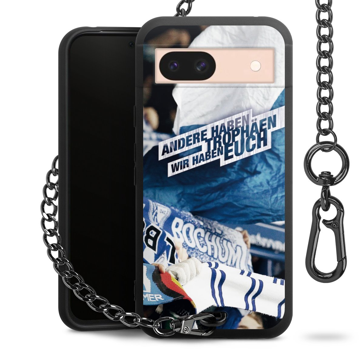 Die mattschwarze Silikon-Handyhülle besteht aus robustem TPU (thermoplastisches Polyurethan). Sie ist flexibel und schützt Dein Smartphone vor Stößen und Kratzern. Die Kette sowie der Karabinerhaken sind aus Metall in Gunmetal-Optik gefertigt. Für dieses Produkt kommen ausschließlich TÜV-geprüfte Materialien zum Einsatz.