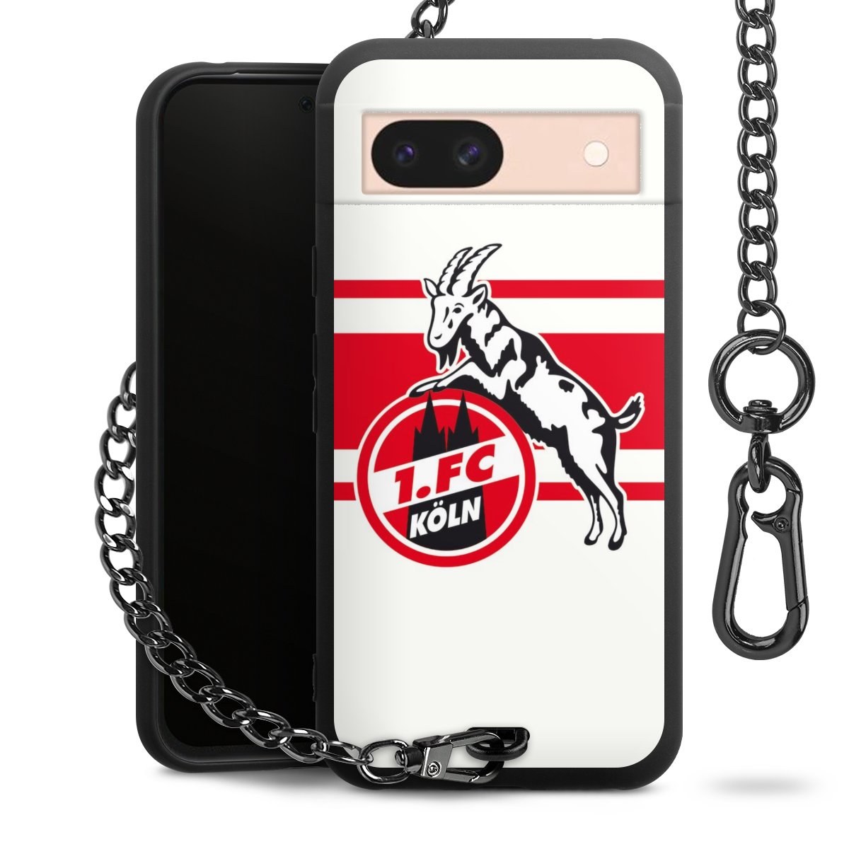 Die Handyhülle verfügt über eine mittig am unteren Rand platzierte Öse, an der die Metallkette stabil befestigt ist. Bestelle die Hülle einfach für Dein Smartphone-Modell, dann passt sie wie angegossen und Du brauchst sie bloß einmal anzudrücken. Handy in die Tasche, Karabiner an den Hosenbund – schon kann die Party starten.