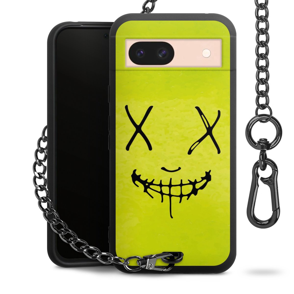 Die mattschwarze Silikon-Handyhülle besteht aus robustem TPU (thermoplastisches Polyurethan). Sie ist flexibel und schützt Dein Smartphone vor Stößen und Kratzern. Die Kette sowie der Karabinerhaken sind aus Metall in Gunmetal-Optik gefertigt. Für dieses Produkt kommen ausschließlich TÜV-geprüfte Materialien zum Einsatz.