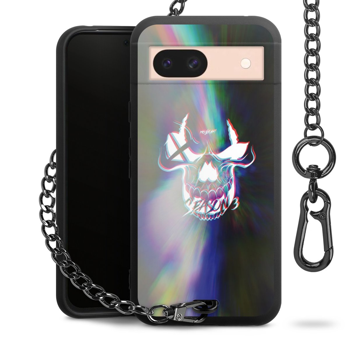 Die mattschwarze Silikon-Handyhülle besteht aus robustem TPU (thermoplastisches Polyurethan). Sie ist flexibel und schützt Dein Smartphone vor Stößen und Kratzern. Die Kette sowie der Karabinerhaken sind aus Metall in Gunmetal-Optik gefertigt. Für dieses Produkt kommen ausschließlich TÜV-geprüfte Materialien zum Einsatz.