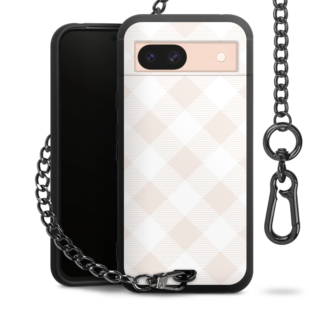 Die mattschwarze Silikon-Handyhülle besteht aus robustem TPU (thermoplastisches Polyurethan). Sie ist flexibel und schützt Dein Smartphone vor Stößen und Kratzern. Die Kette sowie der Karabinerhaken sind aus Metall in Gunmetal-Optik gefertigt. Für dieses Produkt kommen ausschließlich TÜV-geprüfte Materialien zum Einsatz.