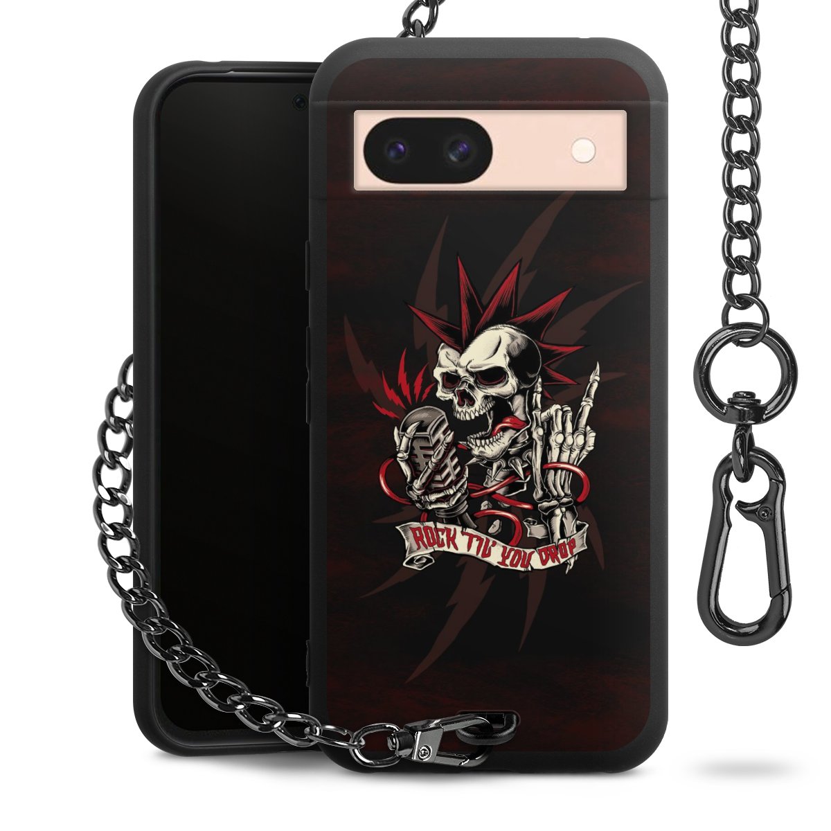 Die mattschwarze Silikon-Handyhülle besteht aus robustem TPU (thermoplastisches Polyurethan). Sie ist flexibel und schützt Dein Smartphone vor Stößen und Kratzern. Die Kette sowie der Karabinerhaken sind aus Metall in Gunmetal-Optik gefertigt. Für dieses Produkt kommen ausschließlich TÜV-geprüfte Materialien zum Einsatz.