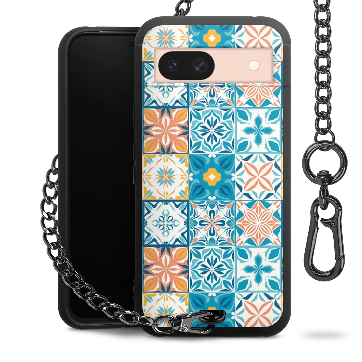 Die mattschwarze Silikon-Handyhülle besteht aus robustem TPU (thermoplastisches Polyurethan). Sie ist flexibel und schützt Dein Smartphone vor Stößen und Kratzern. Die Kette sowie der Karabinerhaken sind aus Metall in Gunmetal-Optik gefertigt. Für dieses Produkt kommen ausschließlich TÜV-geprüfte Materialien zum Einsatz.